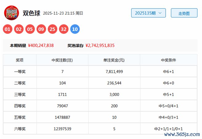 双色球第2025135期开出奖号:红球01、02、05、09、25、32,蓝球10。当期红球三区比为4:0:2,奇偶比为4:2,和值为74,跨度为31,蓝球开出在第三区。