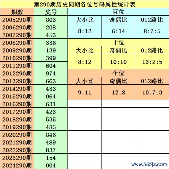 在第290期历史同期开奖中,号码0-9出现频次从高到低永别为:号码3→13次;号码4→11次;号码6→7次;号码0、8→6次;号码5、9→5次;号码1→3次;号码2、7→2次。一般来说,推崇最热的号码:346+08中至少出现1个奖号。同期奖号不会一起出现时推崇最冷的号码中。